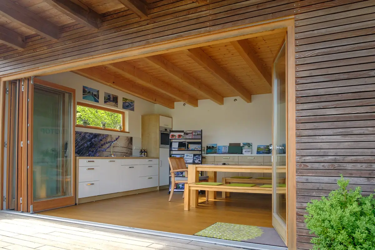 Das Highlight ist der schwimmbereite Living Pool von Biotop inkl. Binder Gegenstromanlage, Keramikplattenbelag, Naturstein-Outdoordusche, großem Holzdeck und angrenzendem Showroom. Zudem können vor Ort viele neue Pflanzungen, Beregnungsanlagen sowie Roboter-Rasenmäher besichtigt werden.