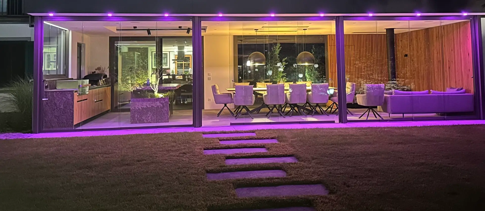 Ein weiterer Höhepunkt sind die Lichtelemente und die Bose Outdoor Soundanlage, die im gesamten Gelände installiert wurden. Zusätzlich wurden weitere Terrassen mit verschiedenen Steinmaterialien und einem festverbauten Grill als Schaufläche gestaltet. Auch das Tinyhouse mit Sauna sowie die Cobus Lounge mit Whirlpool können vor Ort besichtigt werden.