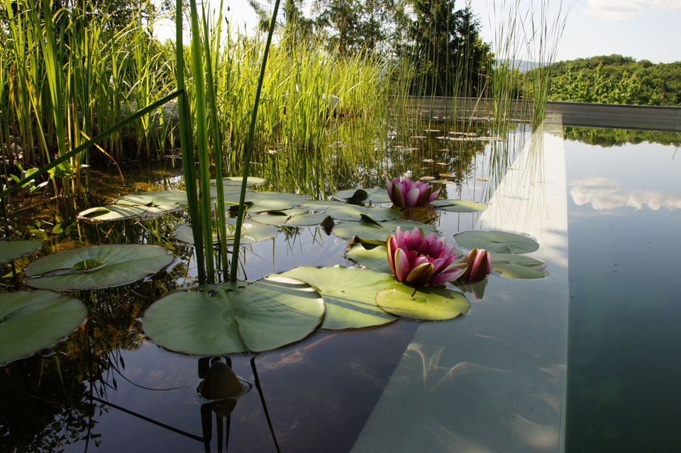 Mit durchdacht angelegten Wasserflächen schafft die Garten ist Urlaub GmbH Gärten, die Ruhe, Natur und höchste Aufenthaltsqualität verbinden.